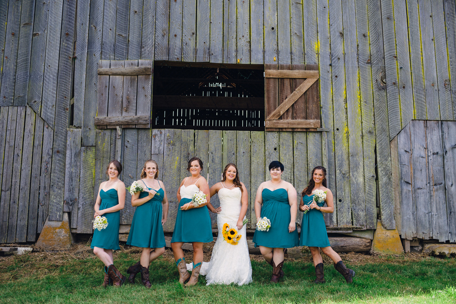 Variety always offers something fresh. You can mix different kinds of dresses and still stay in theme but incorporating the motif with your setting would be amazing. The bridesmaids are wearing a teal themed dress that looks stunning with the white floral wedding gown in a barn setting.