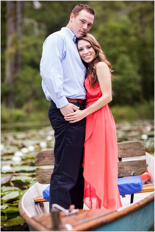 This beautiful photo features the couple standing in a boat. We love the beautiful green trees in the background, and the simple hugging pose.