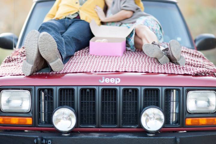 We think this engagement photo, which doesn’t even show the faces of the future bride and groom, is adorable! They’re having what looks like an impromptu donut break on the hood of their vehicle.