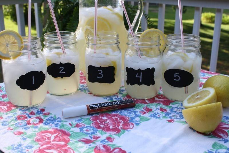 Now you can either create a glass for each guest by using chalk ink, or you can provide small dishes of chalk so that each guest can write their own name on their jar. This way, they can always find the jar that belongs to them, and can reuse it throughout the reception.