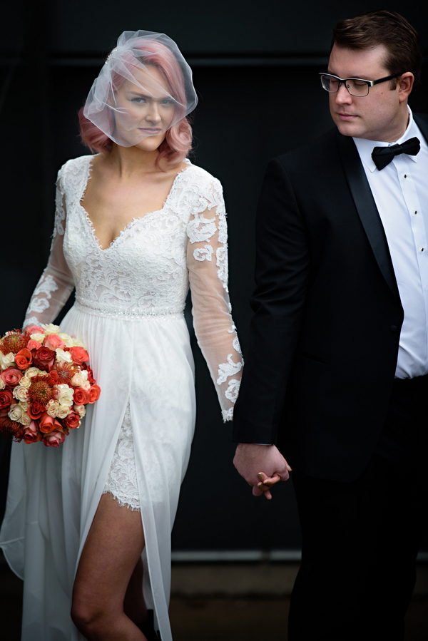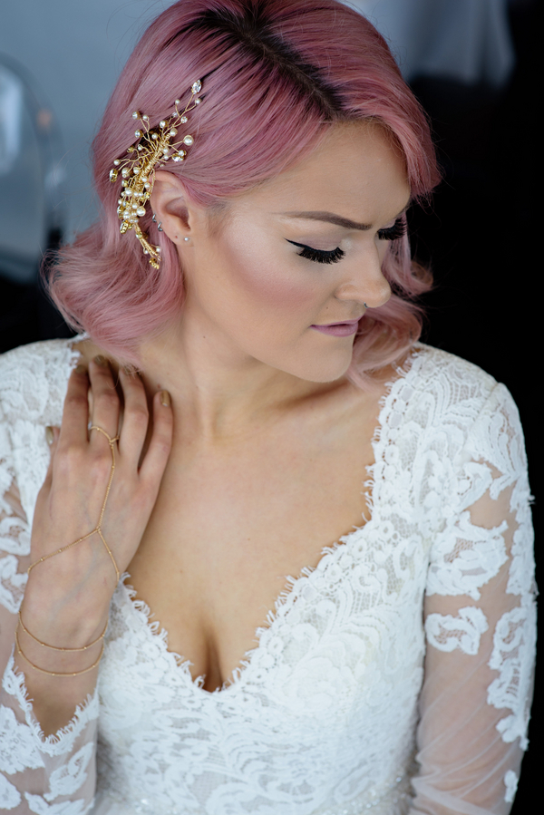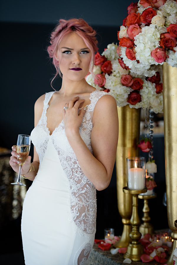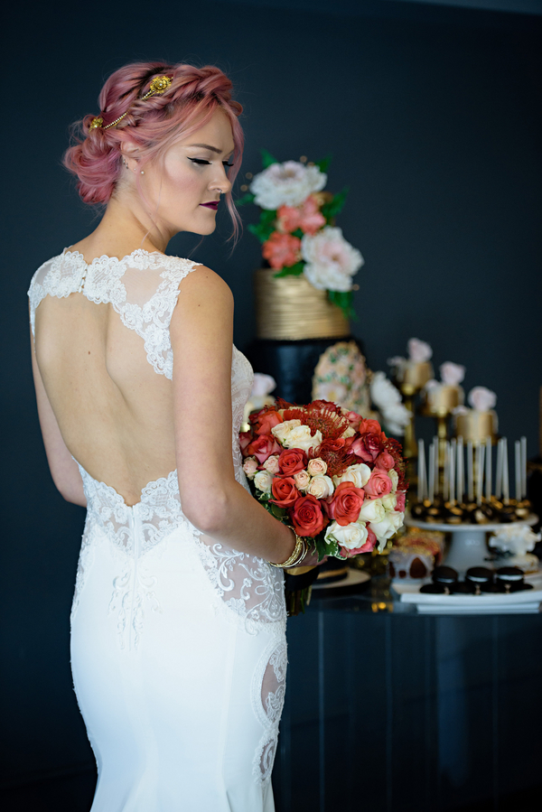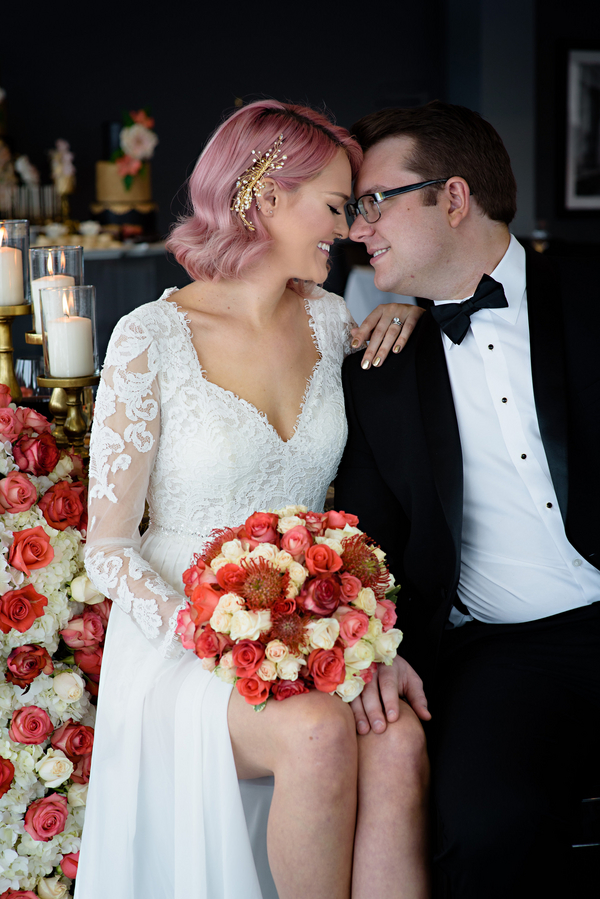 The bridal style. The Bride’s trendy and sleek pink hair perfectly accentuates the lush coral florals and pops of color found throughout. The Bride is adorned a stunning bespoke dress, handcrafted from local designer Luere Luxury and was gracefully accessorized with a delicate hair chain from Blair Nadeau Millinery.