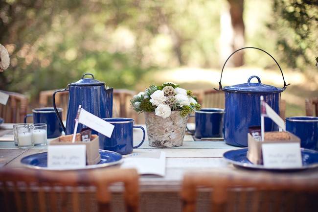 This bride has used camping dishes for serving her reception meal and it’s actually quite elegant! The signature blue of camping plates and serving dishes brings pops of color to her reception tables, and they’re inexpensive so it’s a win-win.