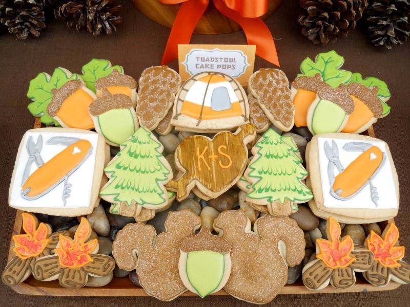 These beautiful camping-themed wedding cookies are a great wedding favor idea! They feature swiss army knives, squirrels and acorns, campfires and more.