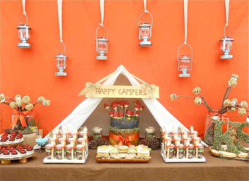 This is a gorgeous table display for the “happy campers!” We absolutely love the hanging lanterns – it gives a rustic but elegant feel to the backdrop.