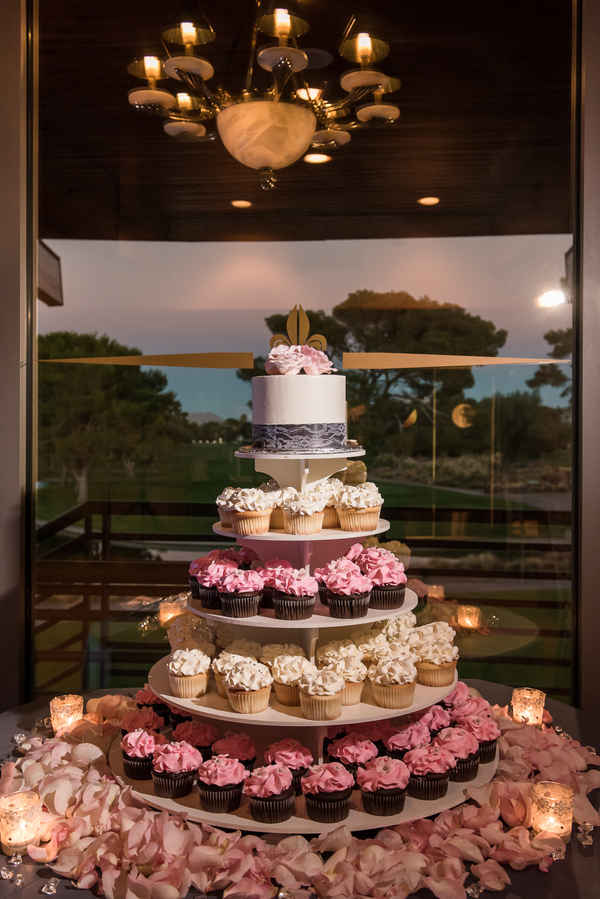 The wrap-up. After they both had said I do at Saint Joseph, we stayed for a few photos and headed to the Las Vegas Country Club. The reception was held indoors, and it featured fantastic views of the golf course. The cupcake tiered cake and florals looked gorgeous with the grey and blush palette. The night was filled with great speeches, lots of love, and kids rocking the dance floor along with the guests.