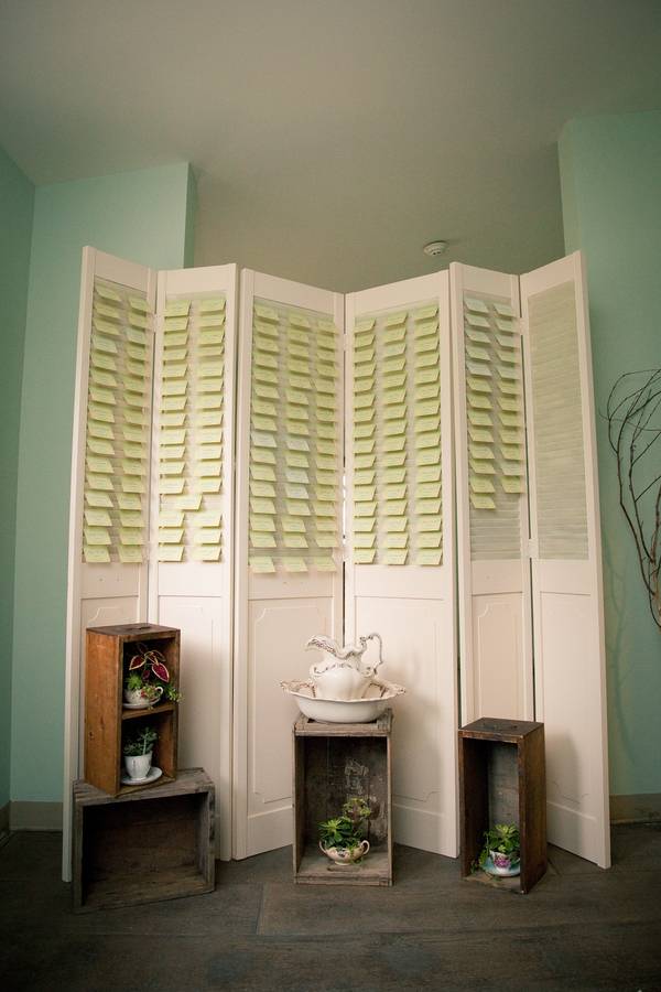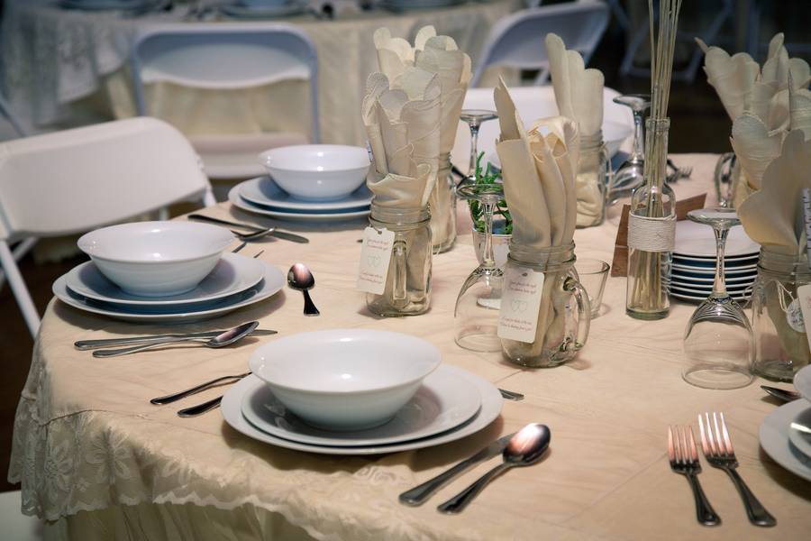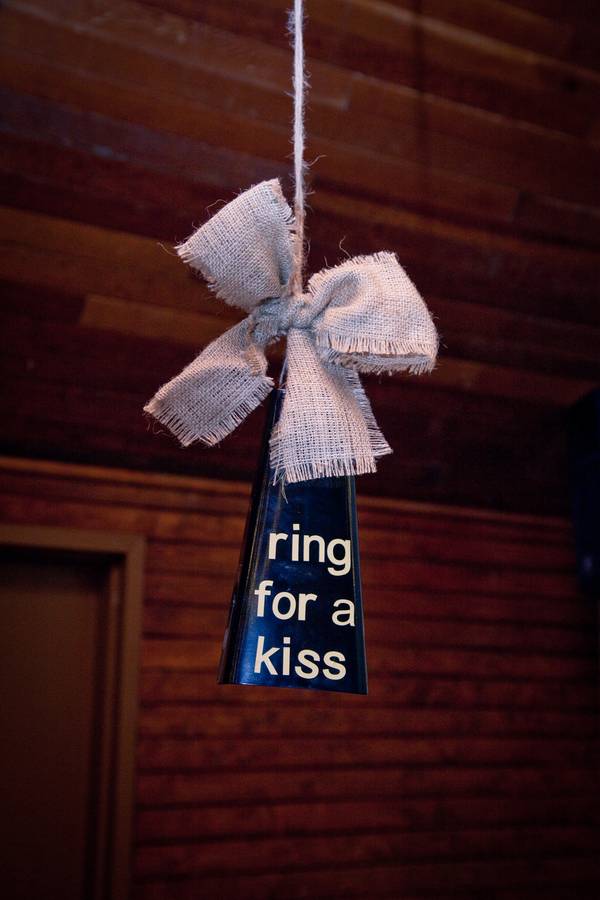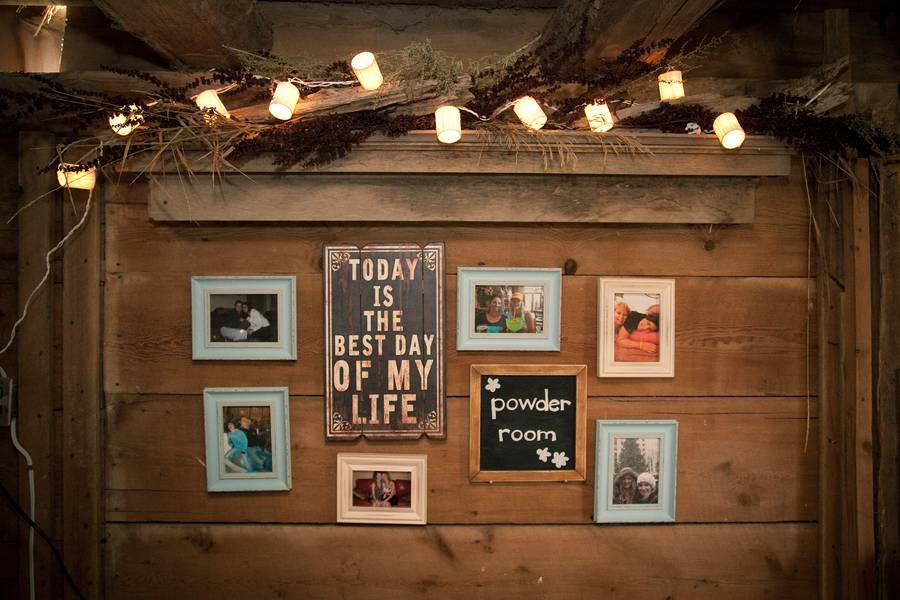 Everything! Mason jar mugs with tags that say, “Your glass for the night for whatever tastes right. Except for drinks at the bar, cheers to drinking from a jar!” (Yes, we made that up.) We made ditch grass centerpieces in buckets, “Where we come from” picture display with pictures of our parents and grandparents, an Old Shutter arbor, and shutters for place cards. The head table fabrics were made by my aunt, mom, sister, and sister-in-law. Signs on the old door with typography by my cousin. The lighting, willow branch chandelier, and carriage doors were provided by her, as well.