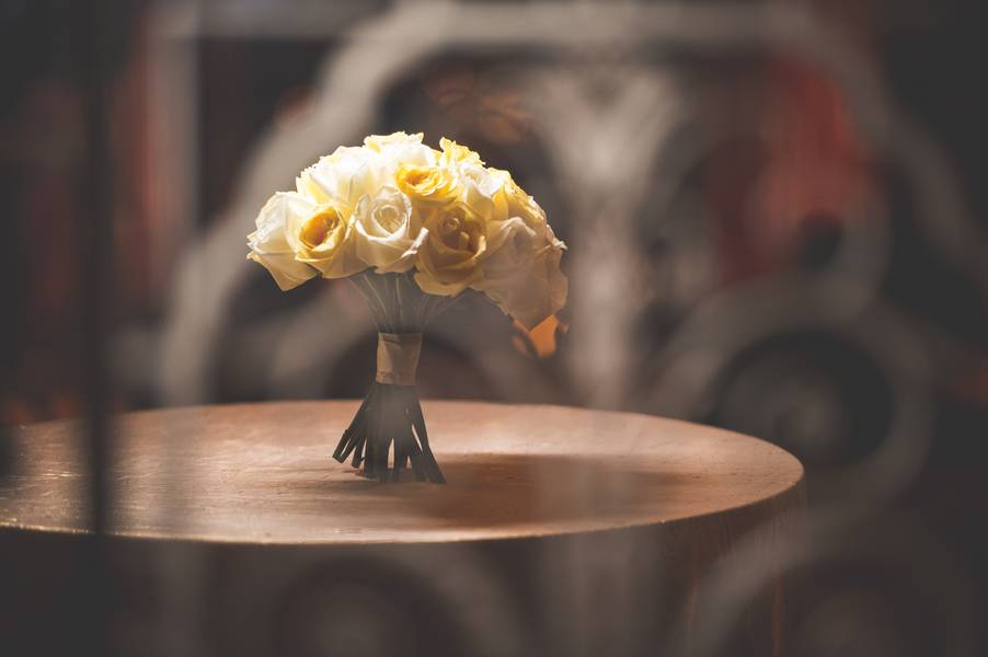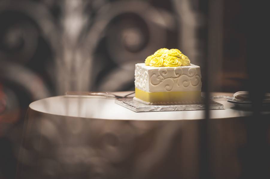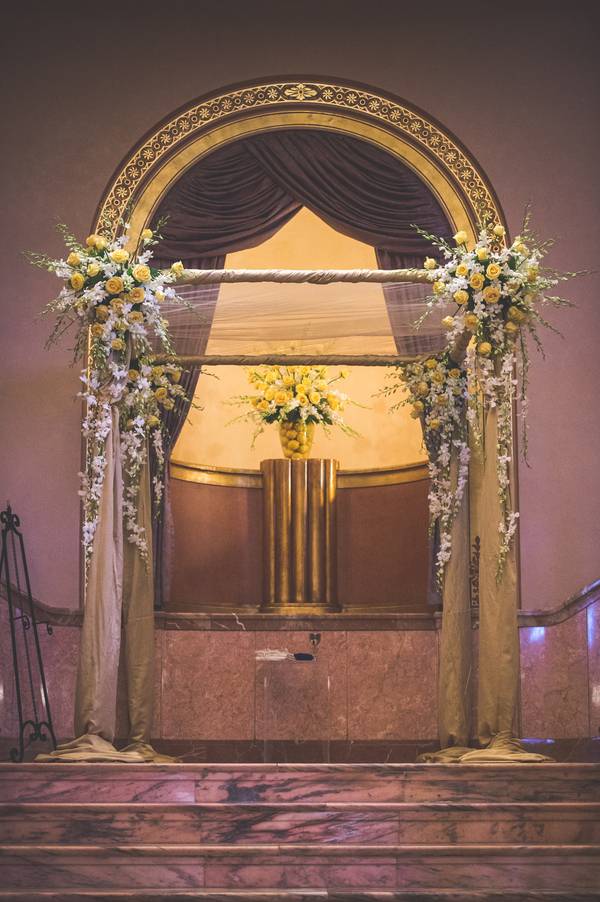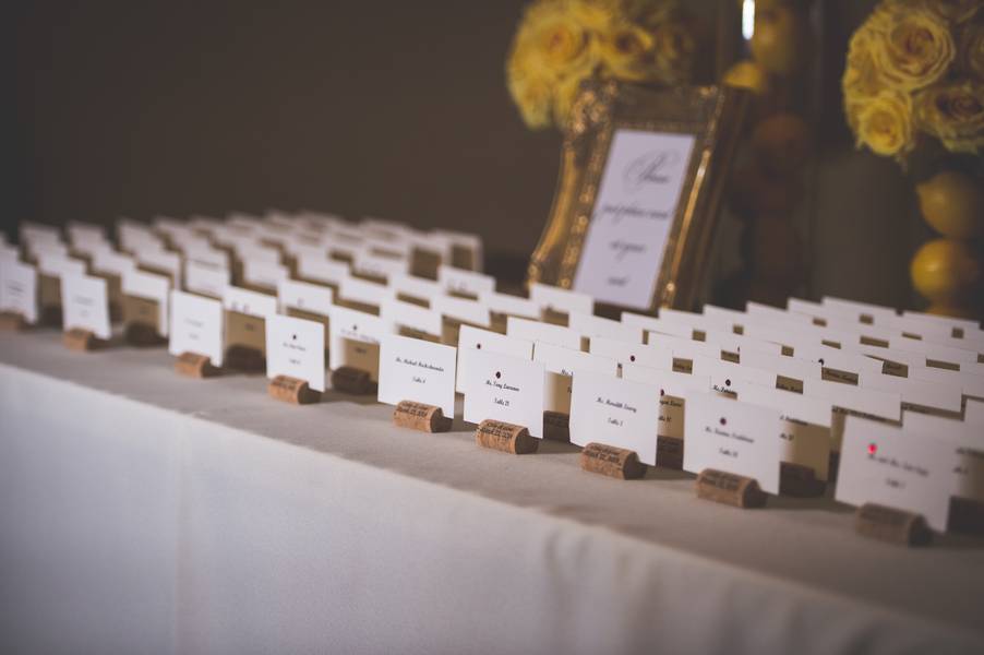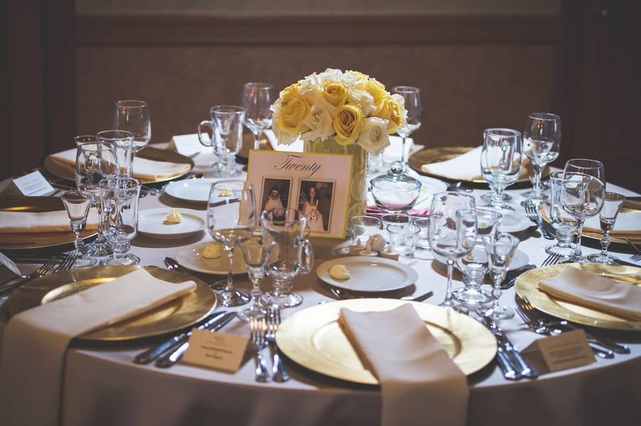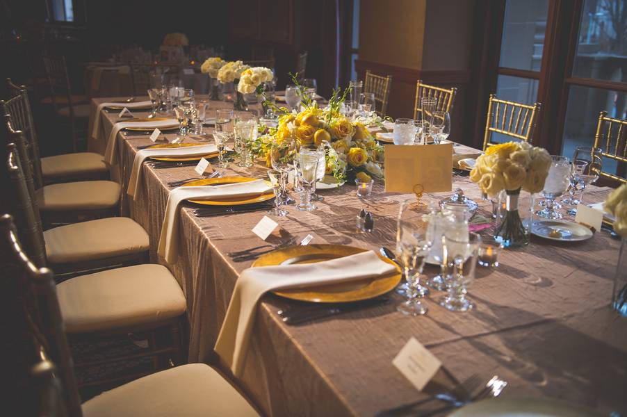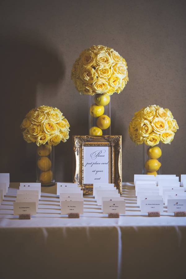 The theme was classic elegance, using warm colors to accent the rooms beauty and not try to compete with it. We went with a color theme of yellow and gold, using lemon as details. We warmed up the room with white roses. We incorporated lemons, because of the grooms love for citrus.