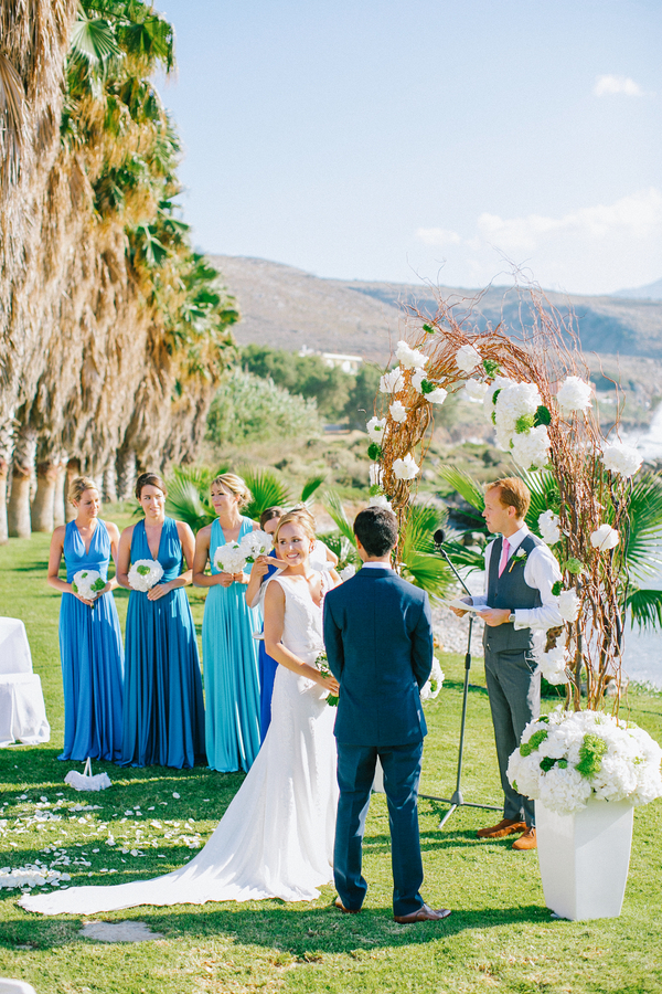 The couple got married near the shore of the Aegean Sea in an exquisite private palm bay. The ceremony was the stuff of dreams! The reception was held at a stunning rustic estate in the hills. 360 degree sweeping views of the Cretan countryside offered the backdrop to this elegant affair.