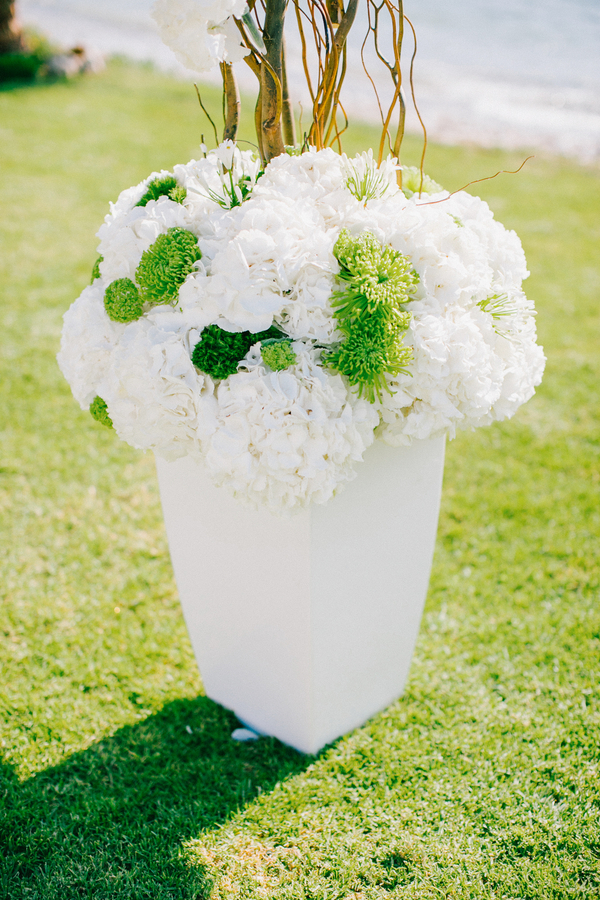 White and green hydrangeas, arranged in gold colored glass vases, added to the elegant look of the tablescapes.