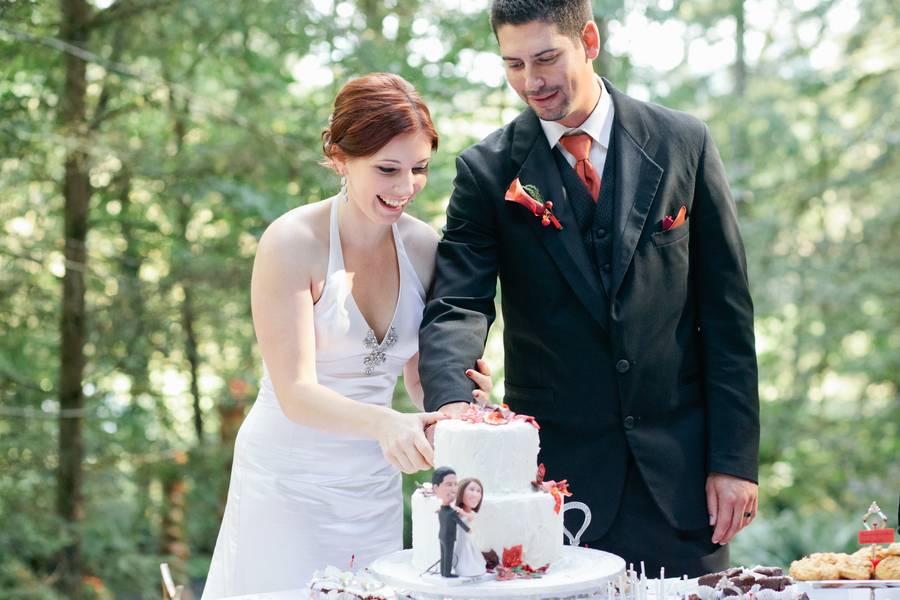 Erin and Jarod were married on in a quaint little forest venue, near Eugene, Oregon. Despite rain on the wedding day, everyone stayed fairly dry, thanks to the large tree cover. Their ceremony and reception were both intimate, with less than 100 guests in attendance.