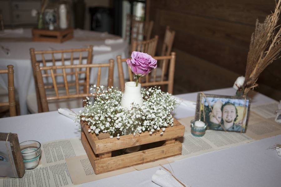 We both love southern culture, and we also love tea, coffee, and books. I tried to incorporate all of this into the wedding and reception, so there are lots of lights, books, hay, and more. And pictures! All of our memories! I put at least one picture of us on each table because we love our memories and we wanted to share them with our friends and family!