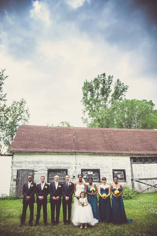 Before getting to the reception hall at La Distinction, we stopped in front of a beautiful barn to take some pictures of the wedding party as well as to do the couple session away from the commotion. Unfortunately, Mother Nature did not cooperate as a strong shower began as soon as the photos of the wedding party were done. While waiting for the weather to calm down, we made our way to the hall where we immortalized some candid moments between the newlyweds and their family members. It does not often happen that the weather is that bad to the point where we have to postpone the couple session.