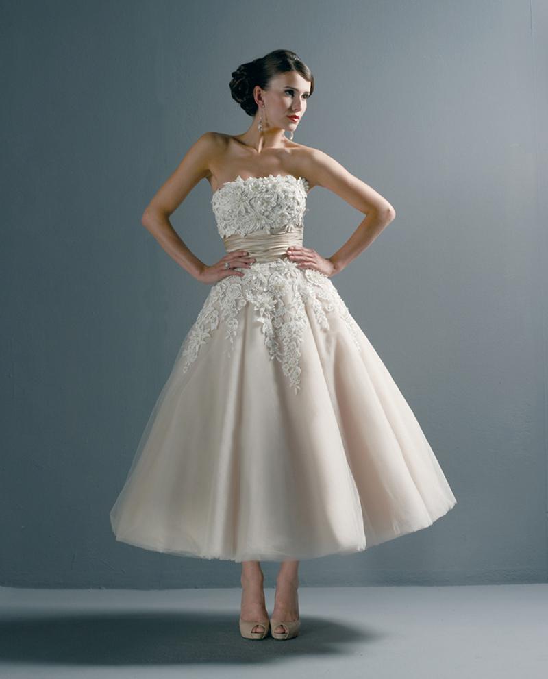 This ankle-length masterpiece from dhgate.com is just gorgeous. It’s champagne-colored and features beautiful fabric embellishments along the bodice and skirt, as well as a charming sash which flatters the figure. While it’s not quite “short,” it is shorter than a traditional wedding gown and perfect for a summer wedding.