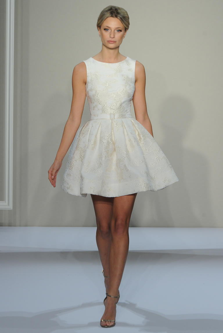 This Dennis Basso dress from the fall 2016 collection is a stunner and perfect for the bride who wants to show off her gorgeous legs. It falls to mid-thigh, and features subtle embroidery and a buckled sash that gives it a modern and streamlined feel.