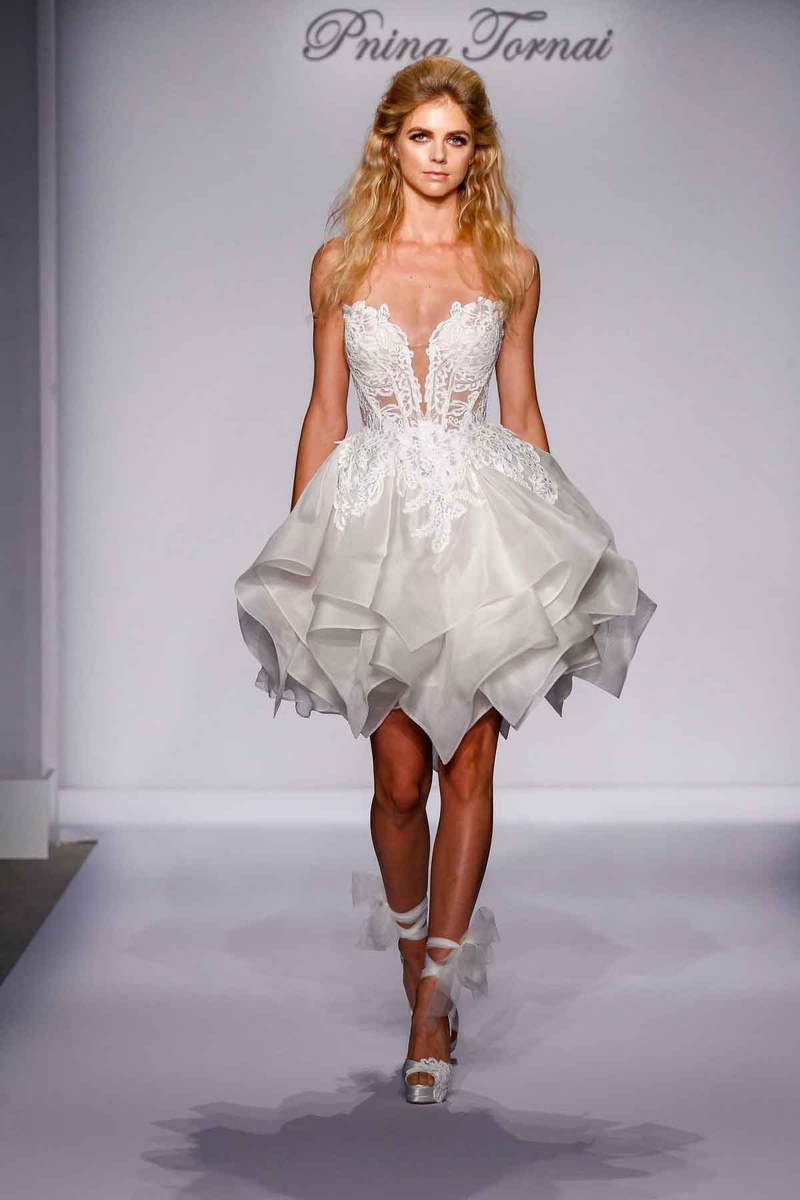 Pnina Tornai for Kleinfeld features this unbelievably beautiful and somewhat sexy short wedding dress in the 2016 collection. The skirt falls to mid thigh and is super ruffly, and a corset-style top accentuates a bride’s curves and figure. It’s absolutely a dress for a bride bold who isn’t afraid to turn a few heads, but we think it’s simply amazing.