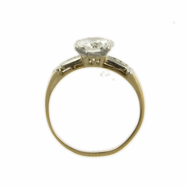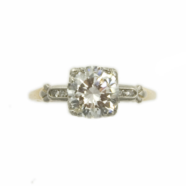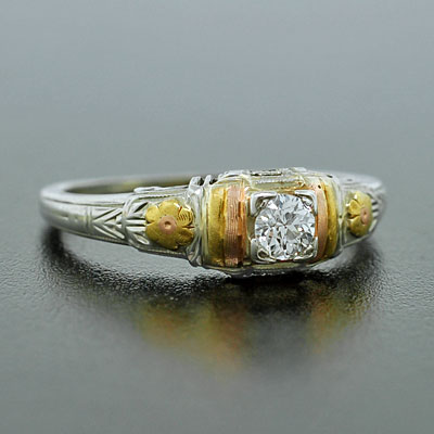 This gorgeous channel set diamond from about 1935 also features mixed metal, and is absolutely elegant with a millegrain edge and a14k yellow gold shank.