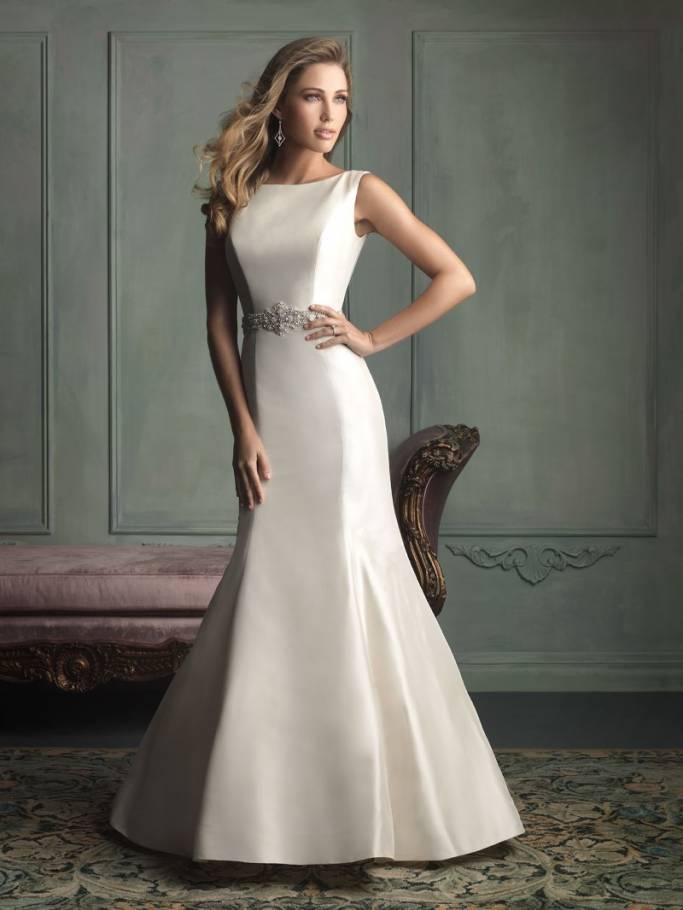 The v-neck is great for anyone who is worried about looking heavy in their dress because it draws the eye to the center of the body and down, giving a slimming illusion. It’s also a very popular choice for wedding dresses.
