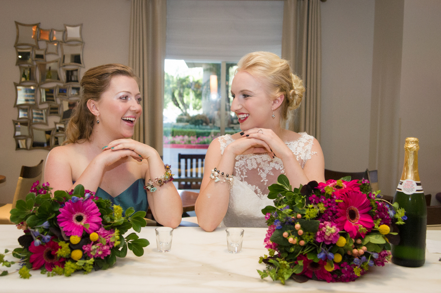 The color palette. The bride strut those turquoise/teal pumps and have everyone asking why she thought those shoes were a good idea. Hot pinks, corn yellows, and deep purple hues added just the right amount of snap found in the bouquets, reception table pieces, and the after party! The electrifying color palette may have been better suited for another occasion, but for these gals, anything shy from over the top color, was unacceptable.