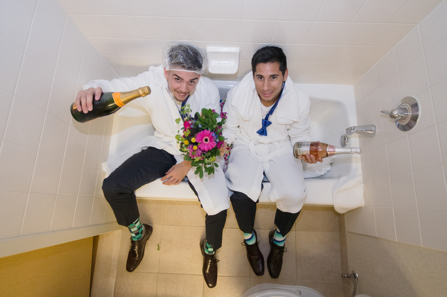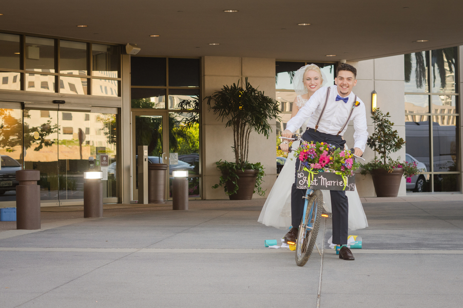 The venue. The Double Tree by Hilton was the perfect choice for this unique shoot as it conveniently located in the heart of Orange County, California, and had everything to offer for this whimsy styled wedding day! From the guest rooms, to the pool area, this hotel delivered! The Groom and Groomsmen got into the swing, with the attention drawn to their accessories; perfectly patterned sock wear and the brightest of suit, bowties, and suspenders. It’s all about the pop when navigating your way through the antics of the day!