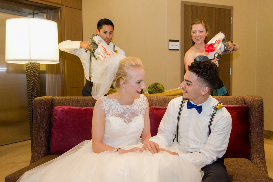 From the guest list to catering, every planning couple wants their wedding to be absolutely perfect. They are hoping everything goes well and there will be no one around to stir up trouble. Especially since they have invested so much time on the special day and probably have had mini breakdowns here and there, anyone posing to be a nuisance on their wedding day would absolutely put him or her over the edge. However, what would happen if the bride and groom themselves, were the ones causing chaos at their very own wedding? Sit back, and get ready, for a playful, mischievous ride through this hilarious, and joy filled wedding day styled shoot!