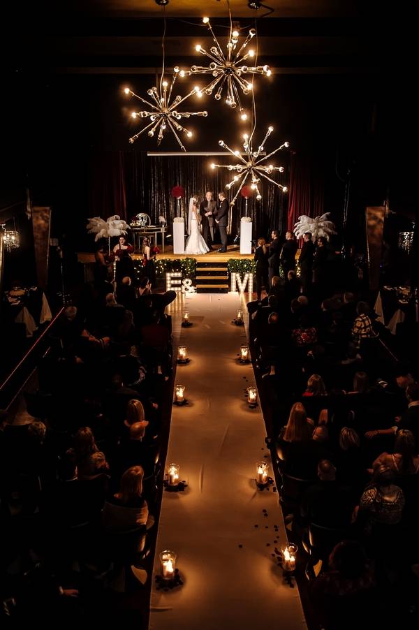 Emily and Matt had an amazing old Hollywood wedding. Emily even DIY-ed the fabulous centerpieces – white feathers in tall vases which softened the black and red motif. The couple stayed true to their theme by having an oscar trophy at their guestbook table and cardboard cutouts of famous Hollywood actors scattered around. The personalized M&M candies that have their faces and wedding date are all amazing!