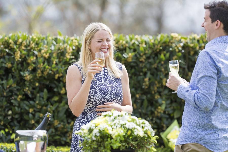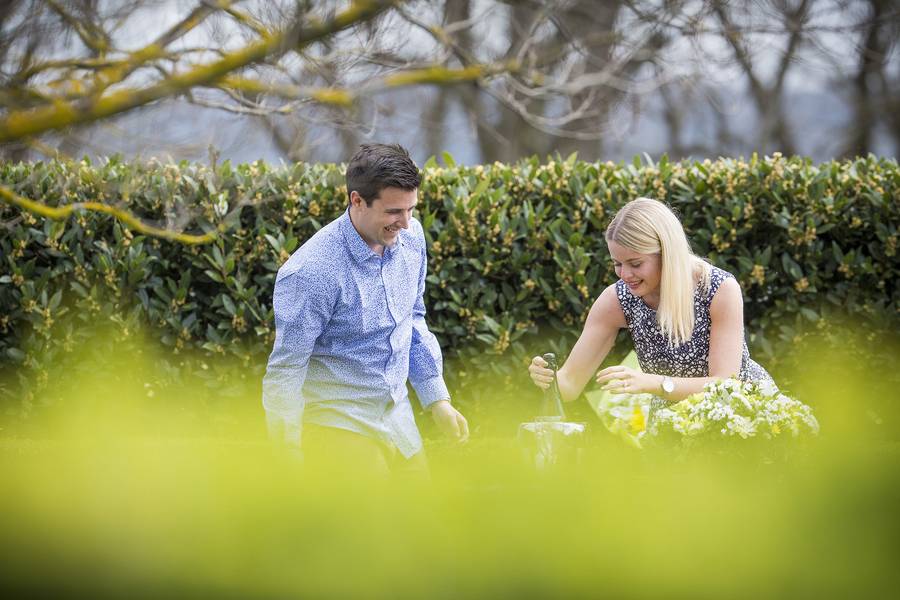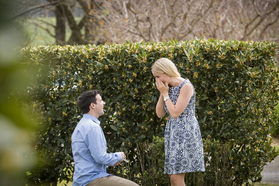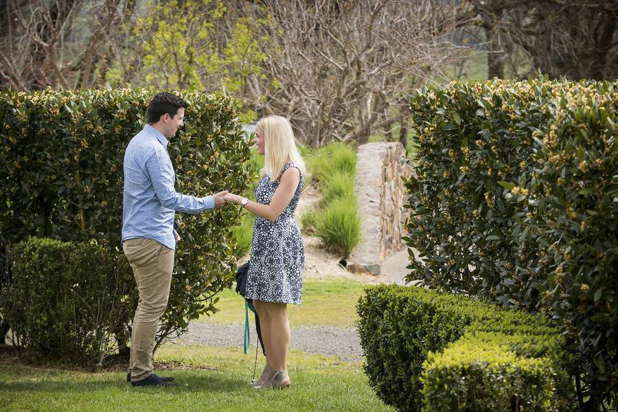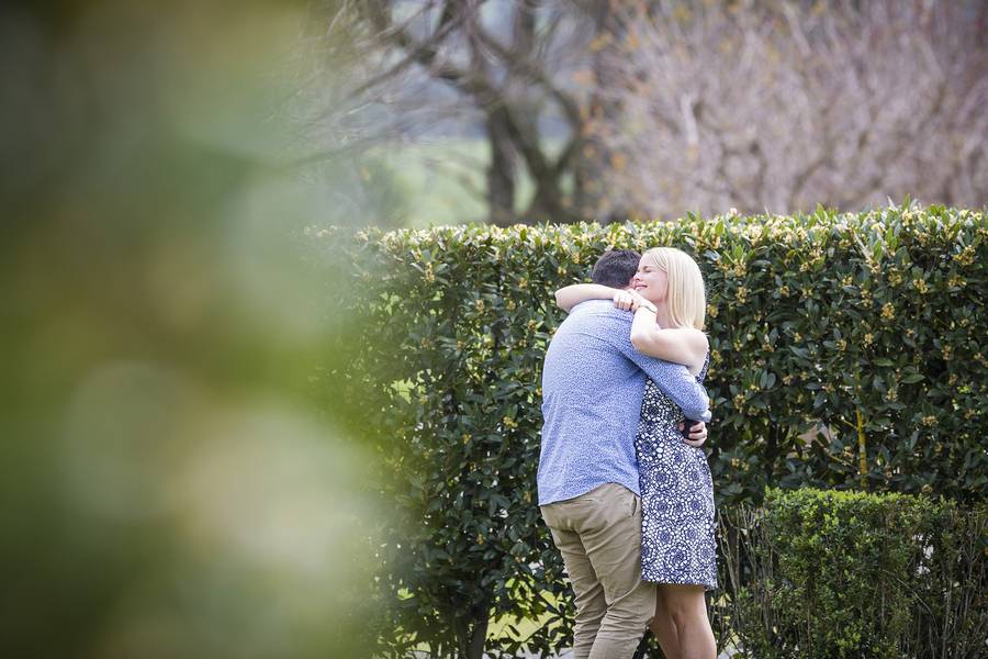 The plan was perfect. The driver was to let Paul know when they were a few minutes away, and that the car will pull up at the end of the driveway, giving me a clear photo of Elise getting out of the car. As she walked down the path, Paul would be hiding behind a private hedge surrounding a single tree, complete with an amazing engagement ring, flowers, cheese platter and of course Champagne from Yering Station! Just before the car approached a group of Asian tourists arrived and were about to walk down the path where Paul planned to propose, thankfully they were Chinese and I was able to communicate with them and explain the plan and they were more than happy to view the Winery from the other way first. They were both excited for Paul and shocked with how fluent I am in Chinese. This is yet another time where speaking a few languages has been a godsend! Anyway, The car came into sight and we could see the car slowing down to turn off the highway into the driveway of Yering Station. We all hid/took our places and 30 seconds later a black BMW sedan pulls up and the driver let’s a very unsuspecting Elise out of the car, she gets out and starts walking down the path. I take a few shots from a distance, using a very long lens then subtly head back into the my discrete spot. Capturing Paul nervously waiting on the other side of the hedge.