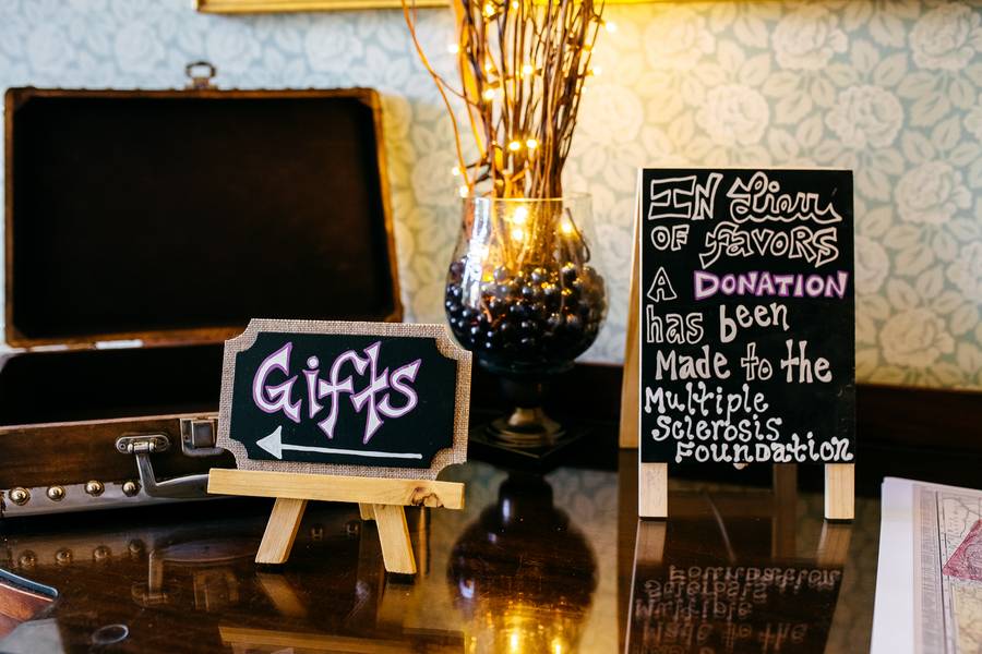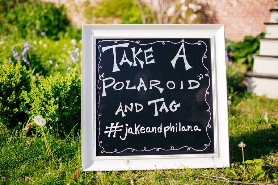 Lots of chalkboards and frames. Framed chalkboards for guests seating info & polaroid station, assorted small chalkboards for gifts and guest signing station, and square framed table numbers.