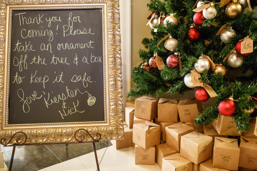 Since the wedding was just a few days before Christmas, they made personalized ornaments for their guests to take home. Some were decorated and others were signed and had the wedding date on them so guests could choose whichever they preferred.