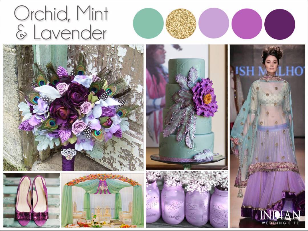 This Indian themed wedding palette shows mint and gold paired with three shades of purple for a beautiful effect. The result is a very royal, boho style that is simply breathtaking.