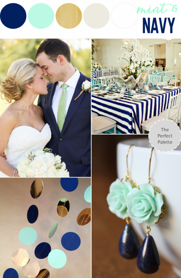 For a slightly more somber look that is great for all seasons, pair mint and gold with navy blue. The result is a preppy, conservative look that works perfectly for formal weddings.