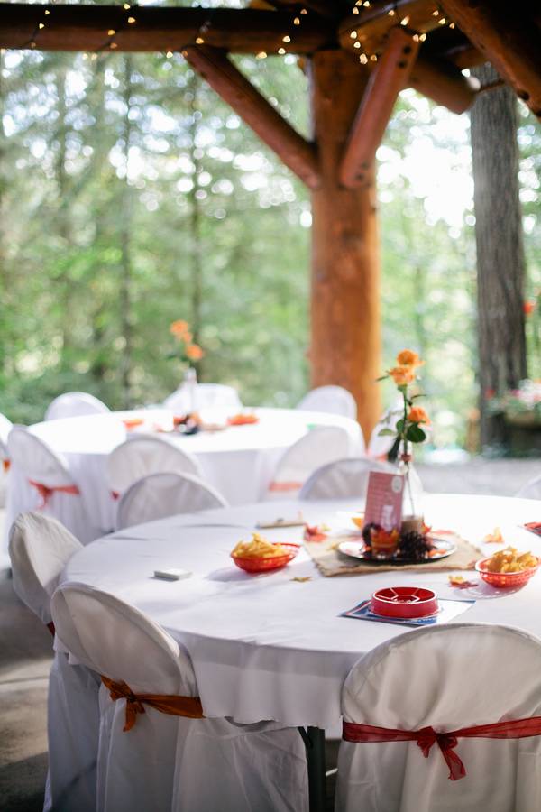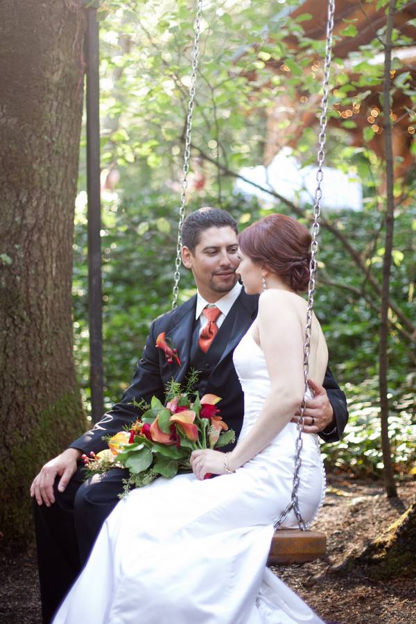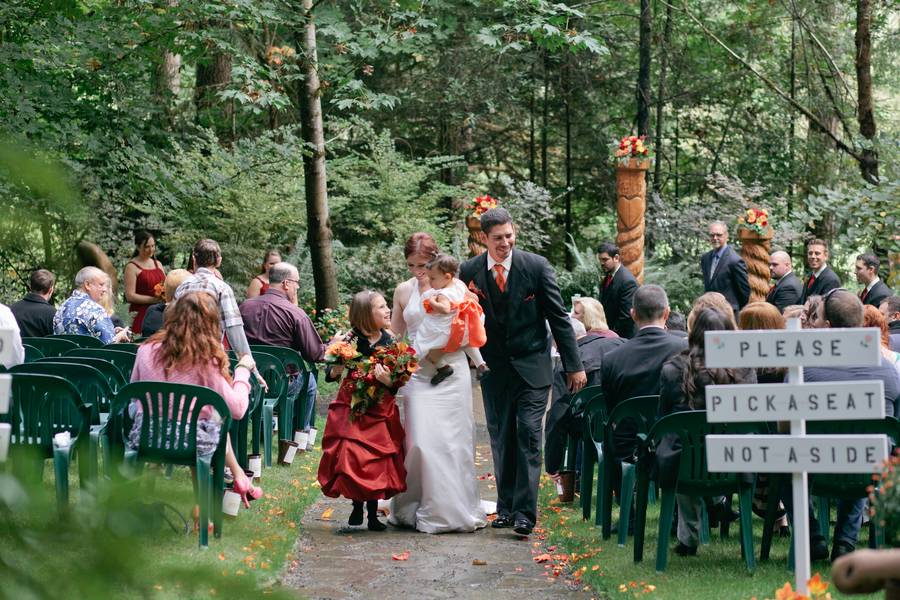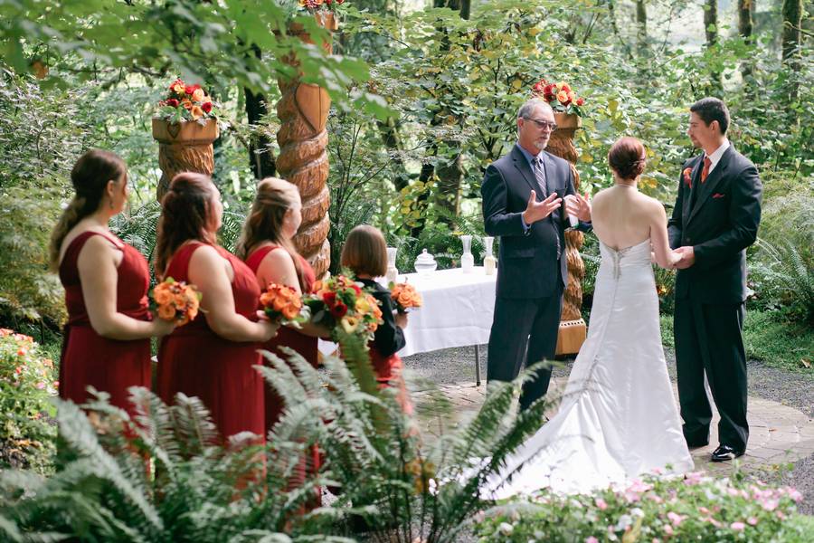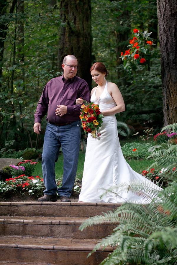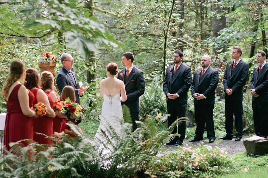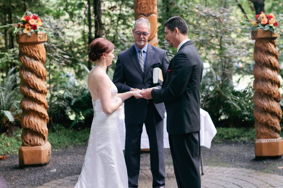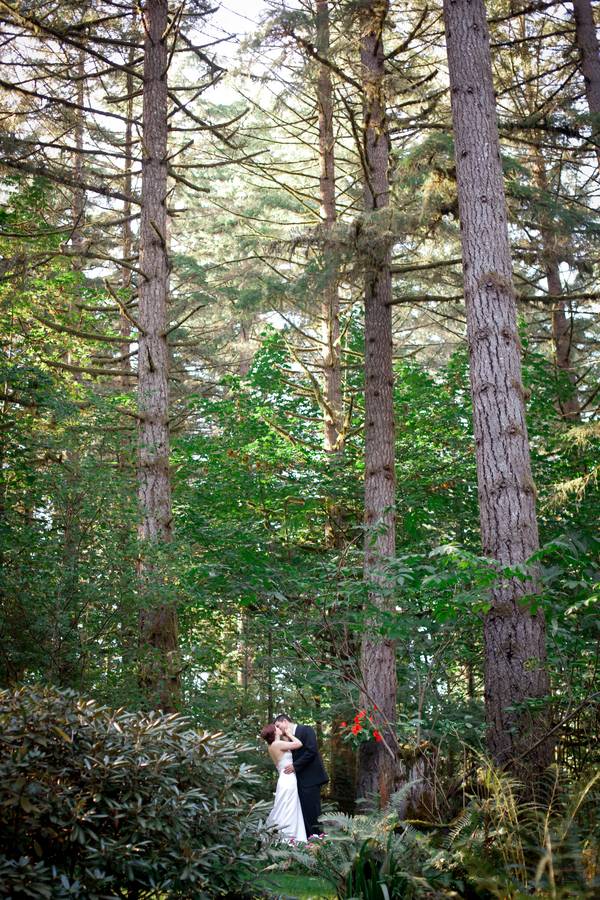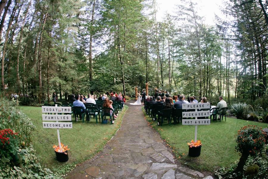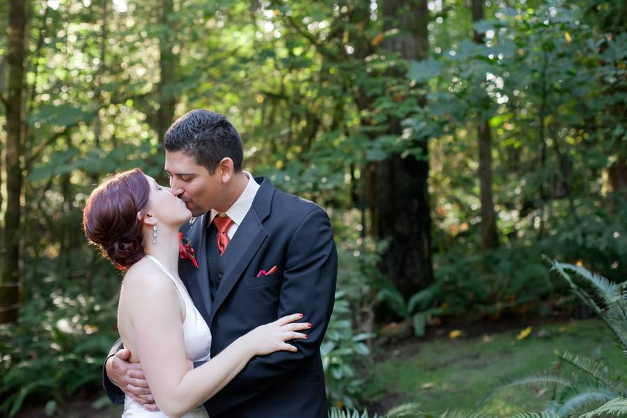Erin and Jarod were married on in a quaint little forest venue, near Eugene, Oregon. Despite rain on the wedding day, everyone stayed fairly dry, thanks to the large tree cover. Their ceremony and reception were both intimate, with less than 100 guests in attendance.