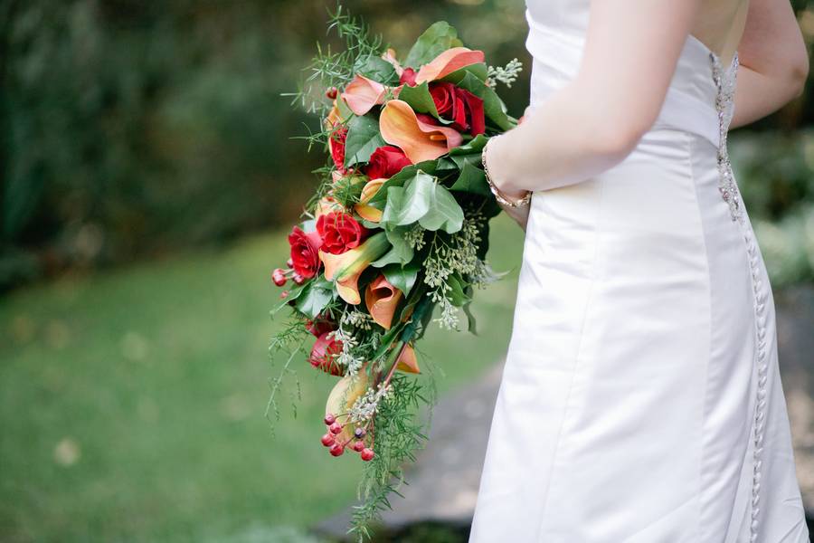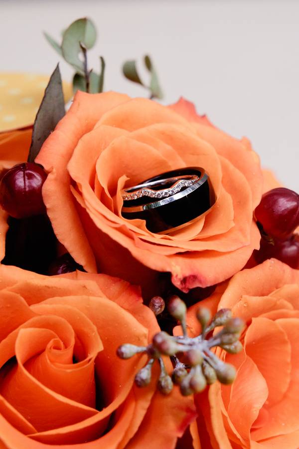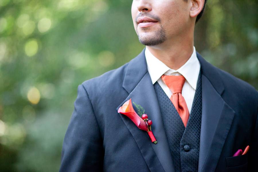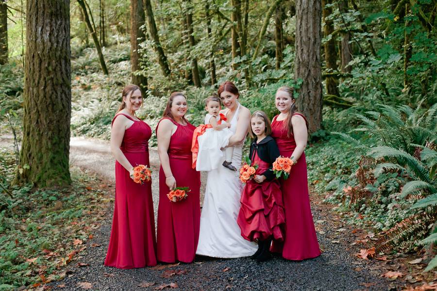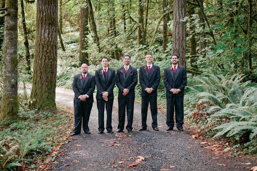 Being that the couple got married in the fall, they went with traditional autumn colors of red and orange. The bridesmaids wore red dresses, with the groomsmen in matching red ties. Jarod wore an orange tie and the flowers throughout the event were red and orange.