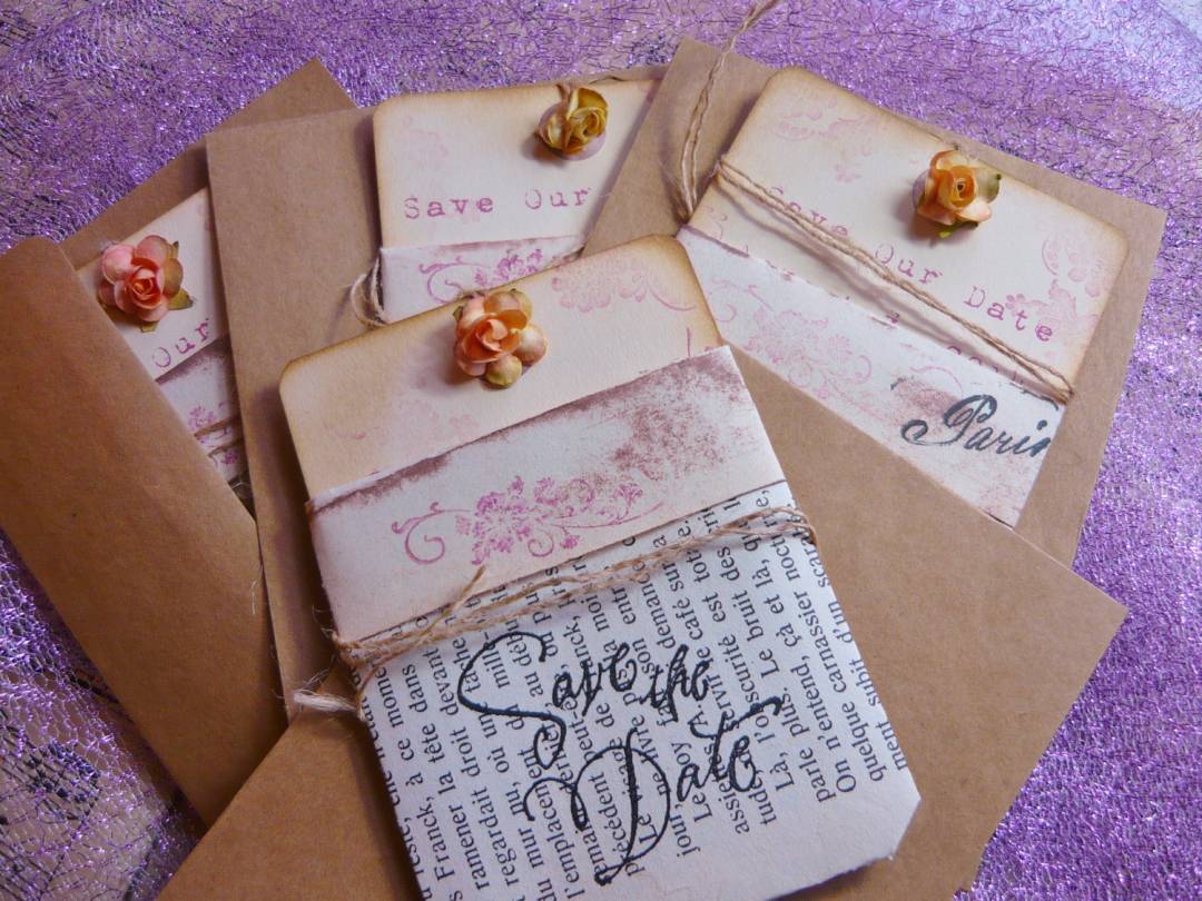 These gorgeous Save the Date cards were created from an old French book! This can be done with any type of old book found at a thrift store or garage sale. It’s great for a vintage-themed wedding.