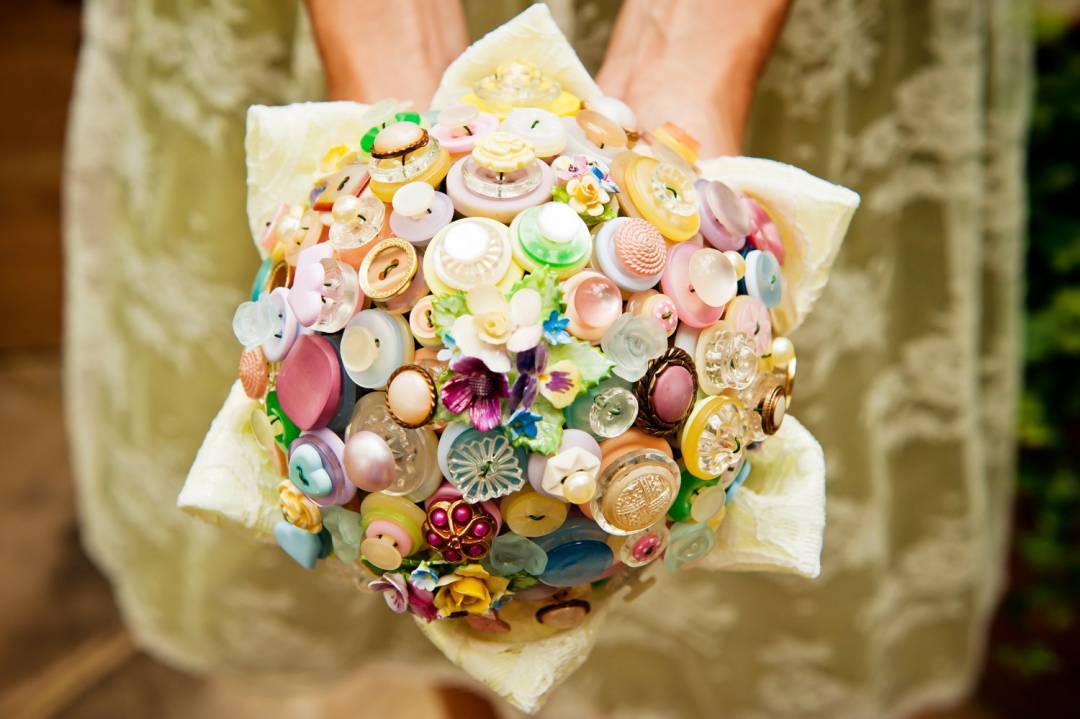 This beautiful button bouquet can be created from old buttons and silk roses found at any thrift store! They’re simply glued to a round Styrofoam form. It’s beautiful, whimsical and great for the non-traditional bride.