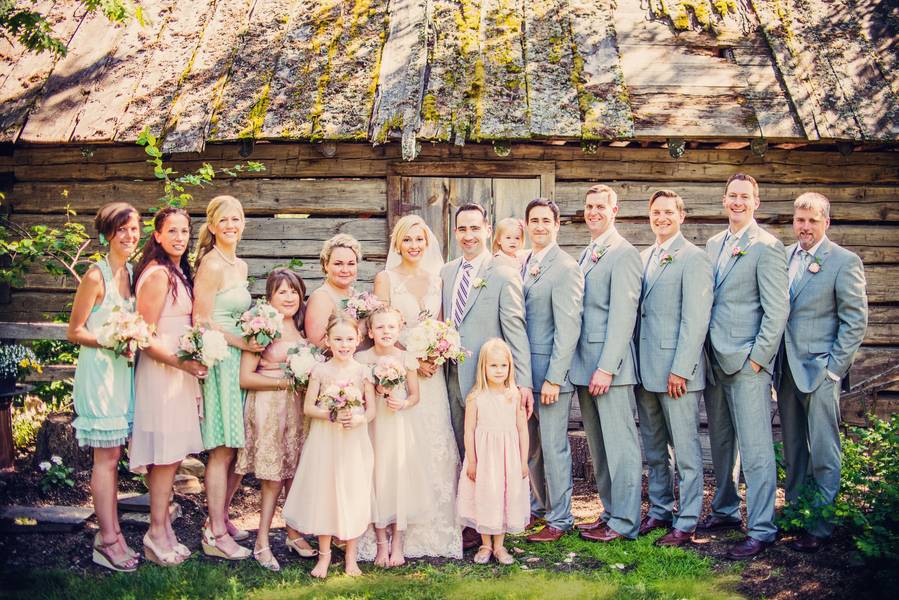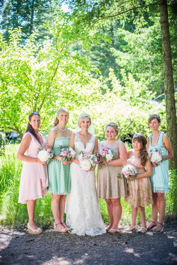 My 5 bridesmaids were all so different that to pick one dress that would suit them all would have been near impossible. So I gave them all the choice of 3 colors, mint, light pink, and a neutral/champagne and asked them to all to pick their own dress. My hope was that the girls would pick a dress that they would potentially wear again and work with each of their budget. It worked out that two of them picked mint, two picked pink and my MOH picked the neutral/champagne, and the dresses all looked great together!! We felt that light grey suits would be best for the groomsmen. Josh mostly drove the decision making when it came to where we would purchase them from and what cut he wanted, my contribution was to pick the shade of grey.