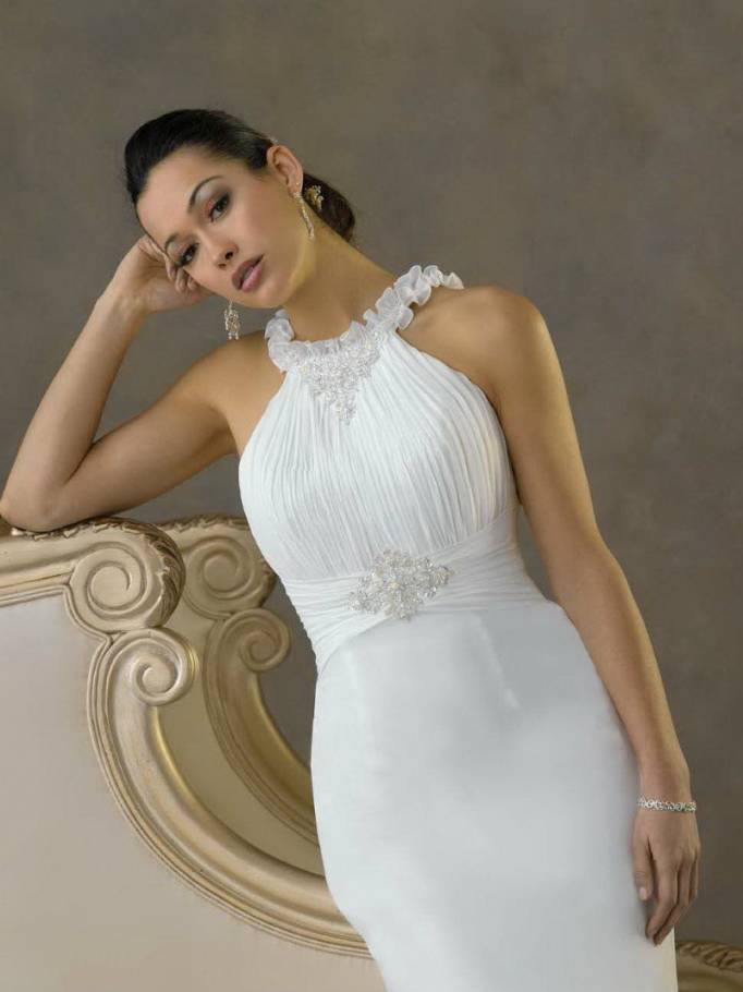 The halter strap neckline is another one that works well with any shape or size. Plus, it works well with any style dress, from mermaid to sheath.