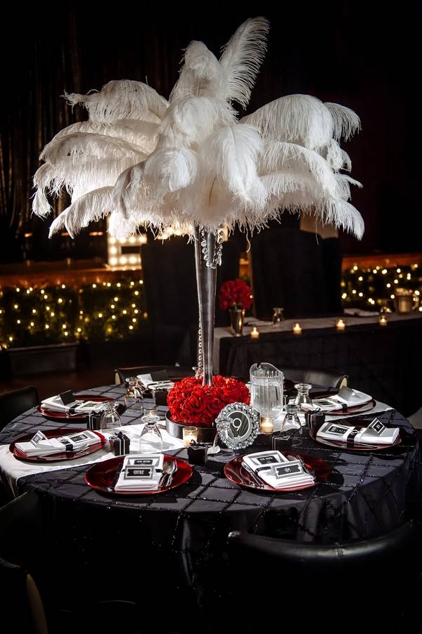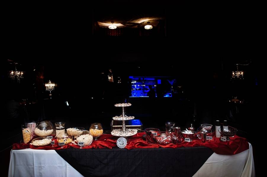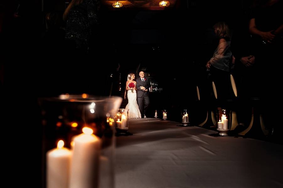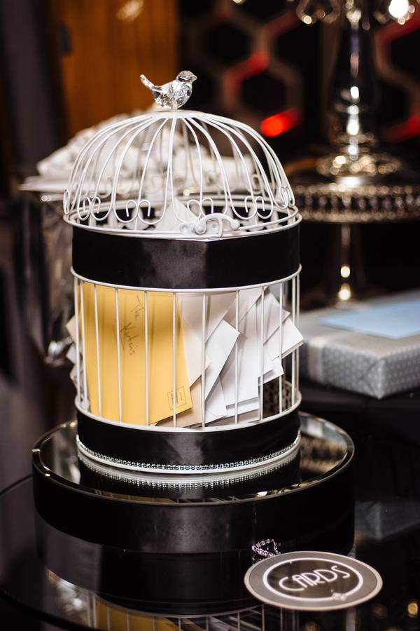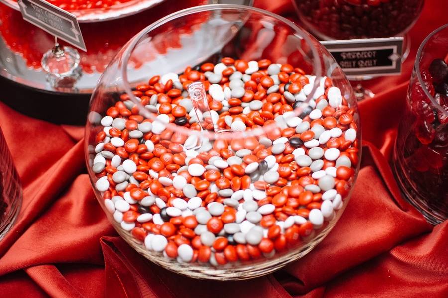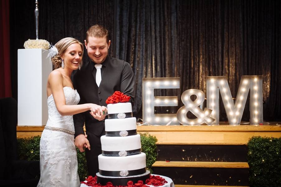 Emily and Matt had an amazing old Hollywood wedding. Emily even DIY-ed the fabulous centerpieces – white feathers in tall vases which softened the black and red motif. The couple stayed true to their theme by having an oscar trophy at their guestbook table and cardboard cutouts of famous Hollywood actors scattered around. The personalized M&M candies that have their faces and wedding date are all amazing!