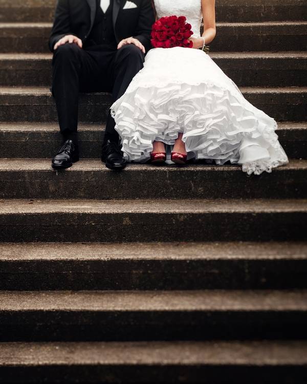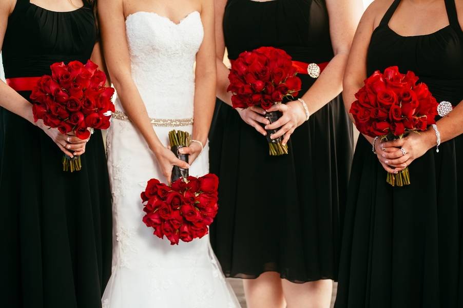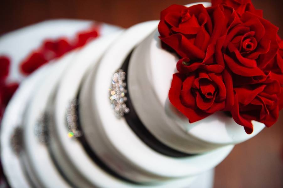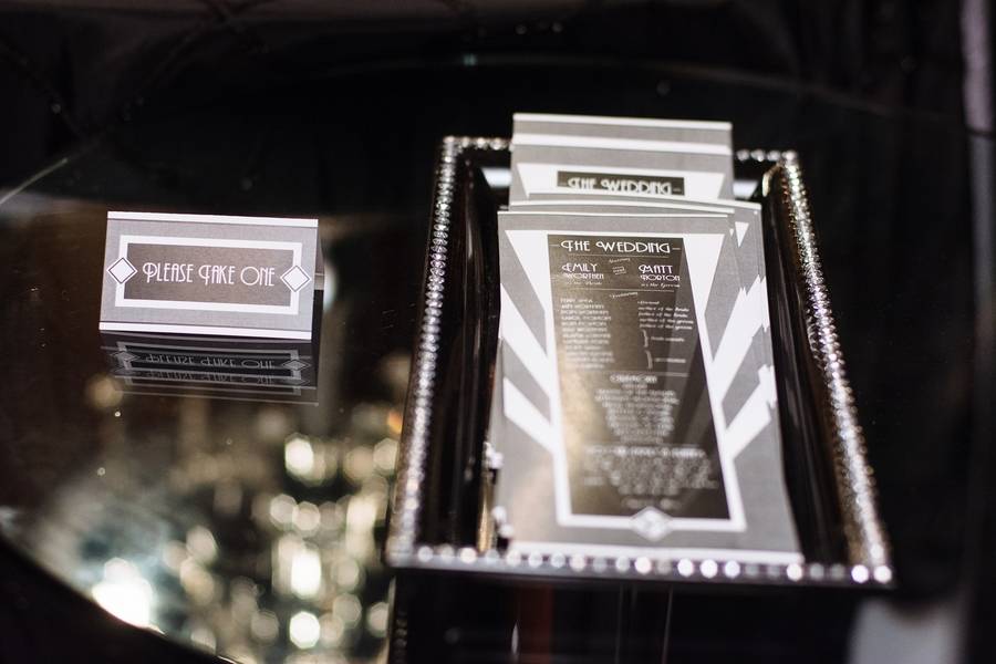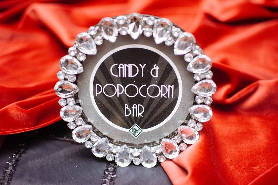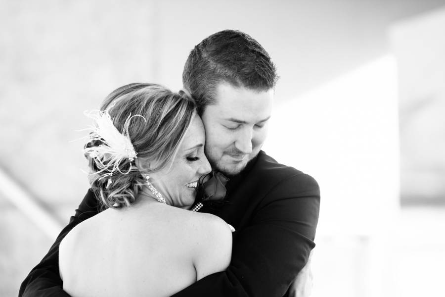 Emily and Matt had an amazing old Hollywood wedding. Emily even DIY-ed the fabulous centerpieces – white feathers in tall vases which softened the black and red motif. The couple stayed true to their theme by having an oscar trophy at their guestbook table and cardboard cutouts of famous Hollywood actors scattered around. The personalized M&M candies that have their faces and wedding date are all amazing!